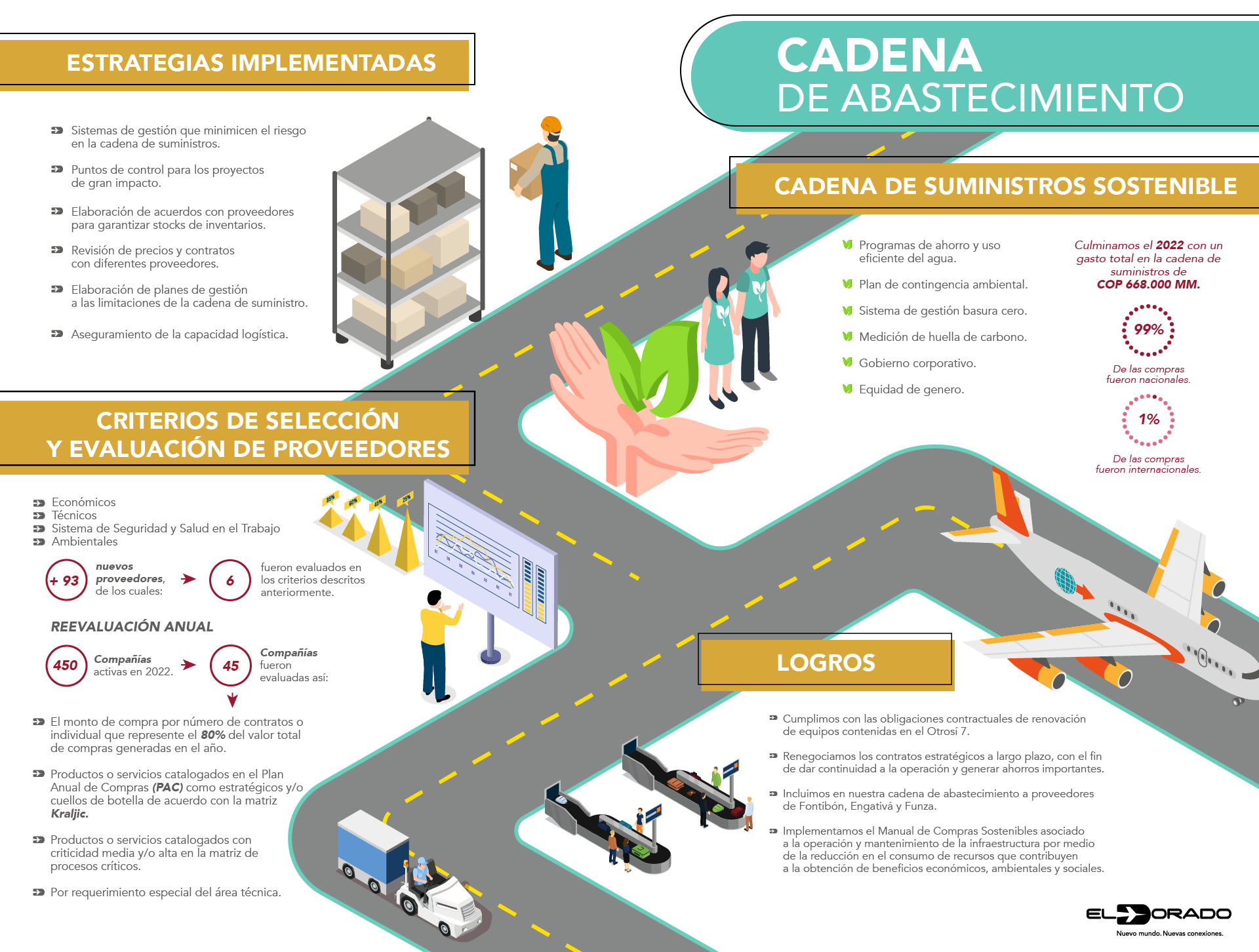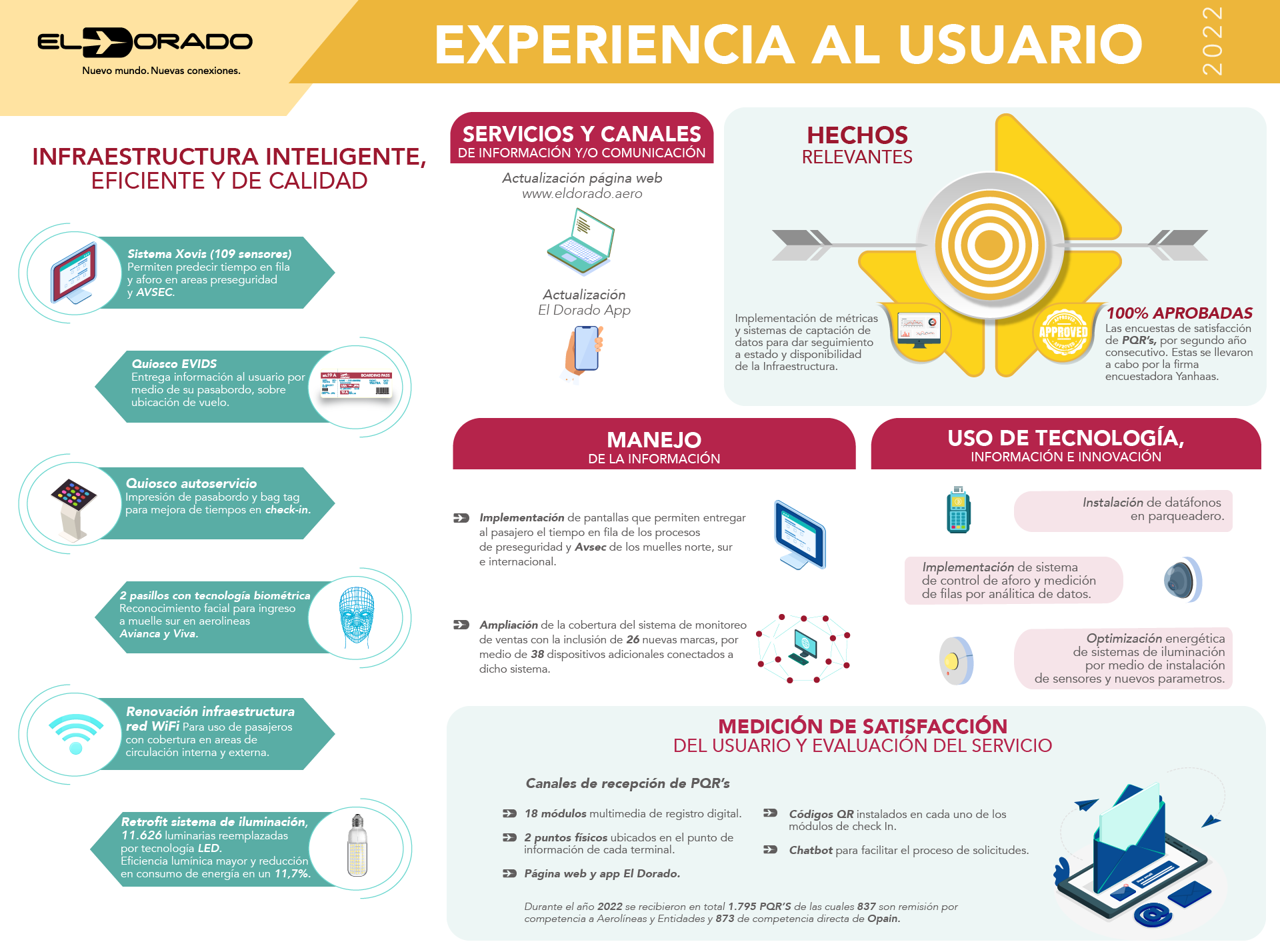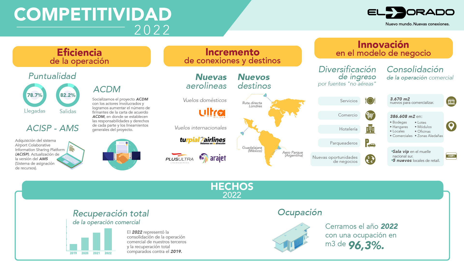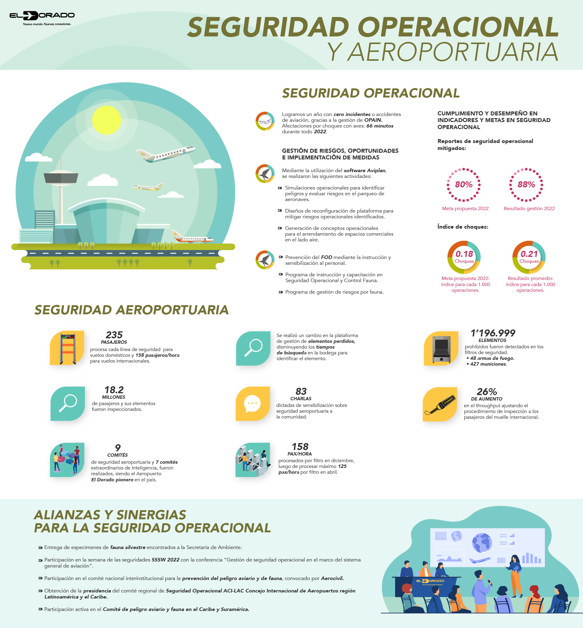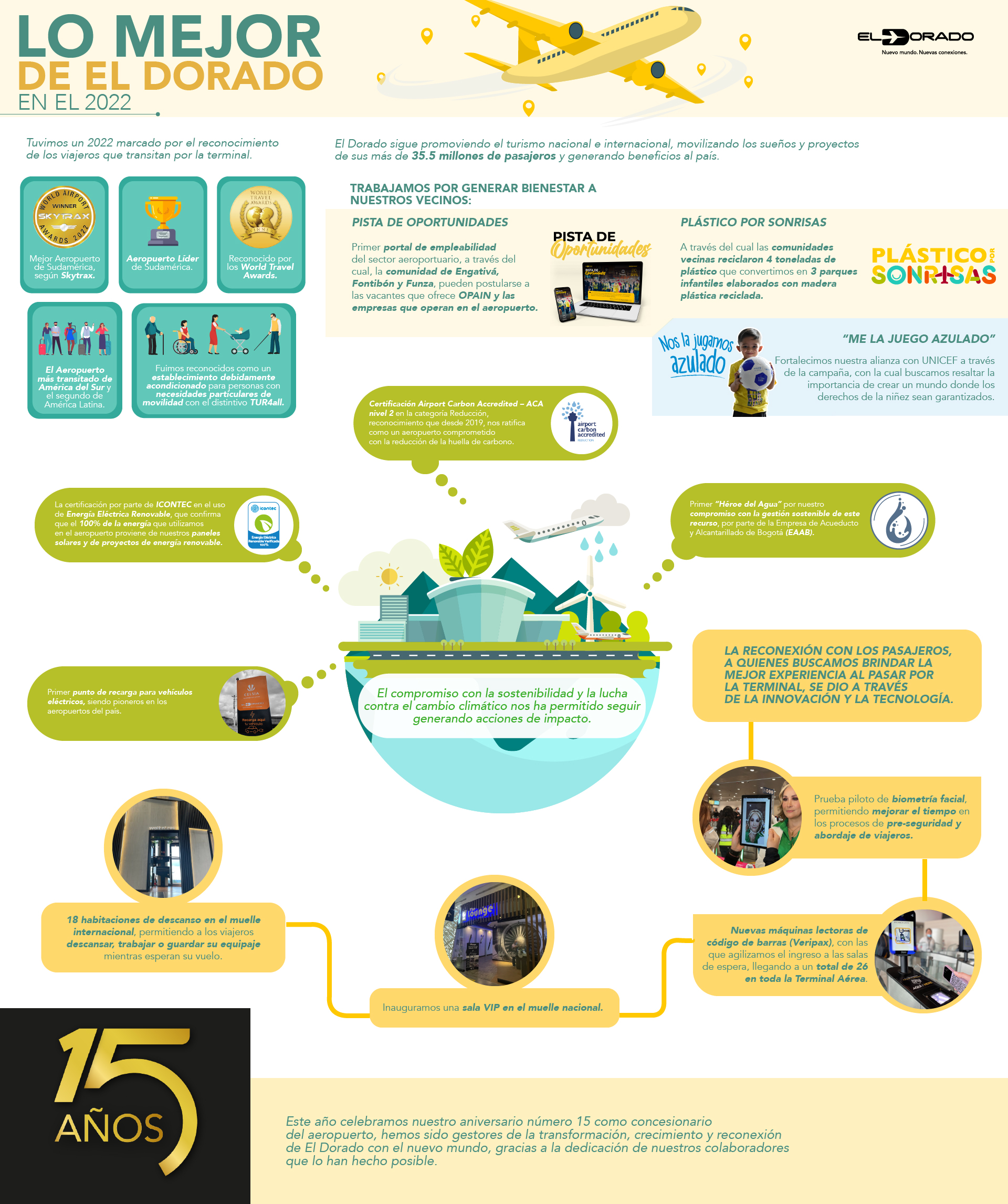 En 2023, 39,5 millones de pasajeros se movilizaron por el Aeropuerto Internacional El Dorado, una cifra récord que nos llena de orgullo y que, a la vez, nos motiva a continuar construyendo conexiones relevantes con viajeros y visitantes, con nuestros colaboradores y con las comunidades vecinas, mediante la puesta en marcha de iniciativas innovadoras y sostenibles que interpretan sus necesidades y deseos.